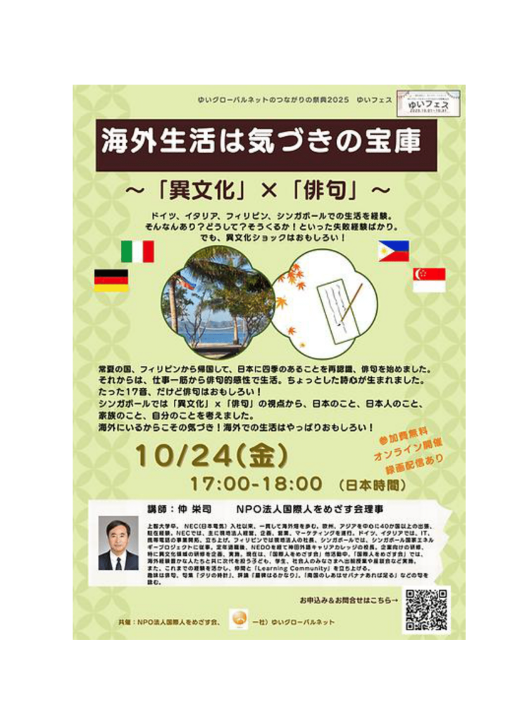 一般社団法人ゆいグローバルネットは、毎年10月/一ケ月をかけて「ゆいフェス」を開催しております。在外邦人を始め、越境する人々の相互支援の輪を広げたいと世界各地にある邦人支援グループを繋いだオンラインフェスです。このフェスに、国際人をめざす会を代表し、「海外生活は気づきの宝庫 ~異文化 X 俳句」と題して、仲栄司理事が講演されました。